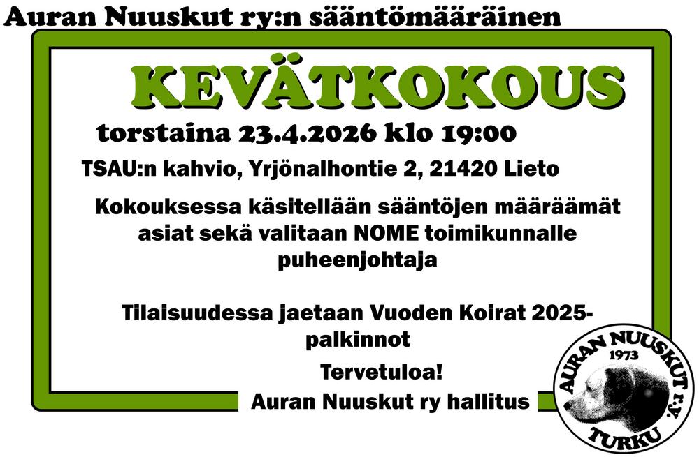 ILMOITTAUTUMINEN AUKEAA 11.1. 2026 klo 9.00 ja sulkeutuu 13.1. Auran Nuuskut ry järjestää jäsenilleen ilmaisen neljän kerran perustottelevaisuuskurssin sunnuntaisin 1.2. alkaen pentuikäisille (4-9 kk)…